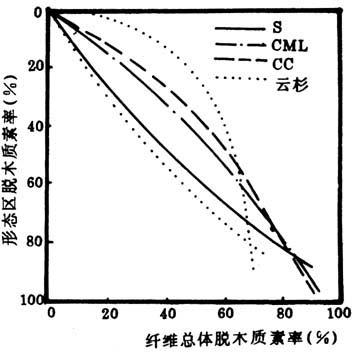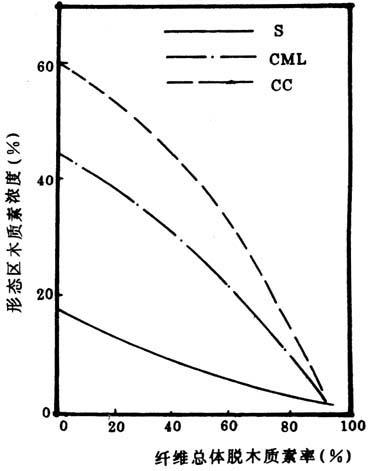 荻硫酸盐法蒸煮细胞组织各微区脱木质素区域化学的差别不很明显(图4-3-4)。在纤维总体木质素脱除率为45%以前,次生壁的脱木质素速度(木质素浓度下降的速度)高于角隅区和胞间层。此后,角隅区和胞间层的脱木质素速度超过次生壁。在纤维总体脱木质素率达到85%时,它们的木质素脱除率达到次生壁的水平,但它们的木质素浓度仍高于次生壁。这是由于它们的初始木质素浓度比次生壁高。继续脱木质素时,它们的脱木质素速度仍高于次生壁。当胞间层木质素浓度降至很低程度(2.8%)时,纤维才能解离,即达到纤维分离点(见图4-3-5和表4-3-2)。而此时纸浆脱木质素率已达到93%,纤维总体木质素浓度只有2%左右,其中大部分木质素残留于次生壁中。
