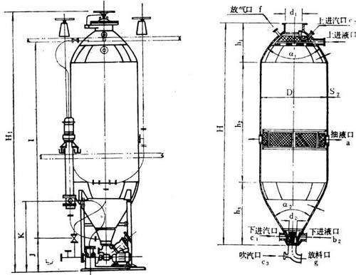 | 释义 | 蒸煮锅 1.蒸煮锅的主要结构及其特点 立式蒸煮锅是用20g钢板或不锈钢复合钢板成形后,焊接制成的上下两端不同锥角的圆筒形薄壁压力容器。上下锅颈及下锅口弯管由ZG25B铸钢材料制成。 蒸煮锅计算工作压力:1176kPa(12kg/cm2); 水压试验压力:1476kPa(15kg/cm2); 正常工作压力:784~882kPa(8~9kg/cm2); 工作温度:175℃。 采用强制循环加热或直接加热蒸煮制浆。 蒸煮锅的特点是:锅的容积大,生产周期短,要求锅内升温迅速均匀,单位产浆量大,生产效率高,与同体积蒸球比占地小。 但蒸煮锅附属设备较多,构造复杂,制造技术要求高,设备投资费用大。 目前国产蒸煮锅定型系列产品有50、75、110m3三种,其结构及主要尺寸见图6-3-1和表6--3--3.6-3-4