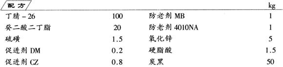 在开炼机上将丁腈-26胶进行塑炼,采用低温、小辊距、低容量的塑炼工艺,塑炼后加入其余全部组分进行混炼,为使混炼均匀,炭黑应分批逐步加入。充分混炼,得到胶料,按胶囊工艺要求成型,经硫化,得到产品。