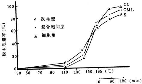 图4-4-7 蔗渣中性亚硫酸钠蒸煮过程中纤维主要部位的脱木质素情况 ①在初始脱木质素阶段,纤维细胞各部位的木质素均有一定的溶出,但脱除率不大。次生壁、复合胞间层和细胞角隅的脱木质素率分别为28.43%,18.34%和15.22%,木质素溶出速率的大小为:次生壁>复合胞间层>细胞角。 ②在大量脱木质素阶段,三个部位的木质素都大量溶出,次生壁、复合胞间层和细胞角的木质素脱除率分别达76.94%、82.90和93.40%,木质素的溶出速率为:细胞角>复合胞间层>次生壁。 ③在残余木质素脱除阶段,木质素继续溶出,但脱除量不大。在165℃下继续保温1h,次生壁、复合胞间层和细胞角的木质素脱除率分别达84.56%、85.23%和96.63%。 由此可见,蔗渣NS蒸煮时,在140℃以前,细胞壁木质素的脱除要快些,而在140℃以后,细胞角和复合胞间层的脱木质素率均大于次生壁的脱木质素率,但三个部位的脱木质素率均低于硫酸盐法蒸煮时相应部位的脱木质素率。总木质素脱除率也比碱性亚硫酸钠法低。 |