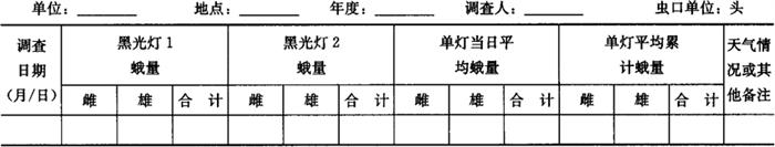 | 释义 | 蔬菜棉铃虫测报调查方法 棉铃虫(Heliothis armigera)属鳞翅目夜蛾科。全国多数省、自治区、直辖市都有发生。以华南、长江流域、西南及华北的河北、河南、山东等地发生较重。主要为害番茄、瓜类、茄子、豆类、苋菜、大白菜和甘蓝等,是杂食性害虫,已知的寄主植物约200多种,是蔬菜生产上的主要害虫,也是棉花的重要害虫。成虫将卵散产在植株幼嫩的顶端、嫩叶、果萼和果柄上,有较明显的趋嫩性。生长势旺、枝叶幼嫩茂密的植株易着卵。每雌虫产卵100~200粒。适宜棉铃虫生长发育的温度范围15~37℃,最适环境温度为25~28℃,相对湿度75%~90%,20℃以下时成虫产卵较少。三龄以上的幼虫能转株、转果为害。过分干旱的年份或降水过多的年份,不利于幼虫入土化蛹和蛹的存活。 1 调查内容与方法 1.1 诱蛾系统调查 1.1.1 调查时间 从当地常年平均发生期前20天至常年平均终见期15天止。 1.1.2 调查方法 1.1.2.1 灯诱成虫 每日晚上6:00至第二天早上5:00(用有微电脑控制功能的灯具)通宵点20W黑光灯2盏,两灯至少相距200m,逐日早上调查集虫箱内诱捕的成虫数。诱虫灯集虫箱内使用广口瓶,内加敌敌畏200ml,用2层纱布封口,每10天添加20ml补液。每日早上收集隔夜诱捕的蛾量,区分雌、雄蛾后。将结果填入表6-79。 表6-79 棉铃虫成虫灯下诱消长调查记载表