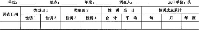1.1.2.2 性诱成虫 用棉铃虫专用性诱剂,高出辣椒植株20cm左右,在不同的类型田内设干式诱蛾器2~4只,下部挂瓶或塑料袋,放1/3位置的清水,相邻2个诱蛾器至少间隔100m,每只诱捕器用诱芯1个,诱芯每月换1次,以确保性诱效果。结果填入表6-80。 表6-80 棉铃虫性诱成虫消长调查表