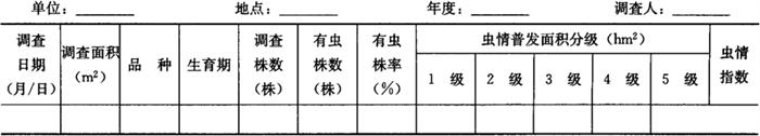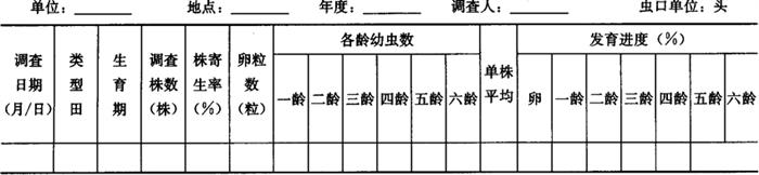 1.2 田间系统调查 1.2.1 调查时间 从当地田间幼虫常年平均发生期前10天至常年平均终见期止。 1.2.2 调查方法 根据当地生产季节和种植的易受棉铃虫为害的作物,分别选有代表性的类型田各2块,每5天1次,采用棋盘式多点取样法,每田定点25个,每点定株2株,共取样50株,调查有虫株率、卵块数、幼虫数、虫态发育进度。将调查结果记入表6-81。 表6-81 棉铃虫田间虫口密度与发育进度调查表