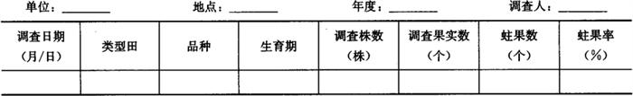 在作物进入结果期后,每田采用对角线5点取样法,每点随机调查20只果实(不查幼果),调查果实蛀果率。将调查结果记入表6-82。 表6-82 棉铃虫幼虫蛀果为害率调查表