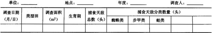1.3 害虫天敌调查 1.3.1 调查时间 每年在各代盛发高峰期后10天左右调查。 1.3.2 捕食性天敌调查方法 根据当地生产季节和种植的易受棉铃虫为害的作物,分别选有代表性的类型田各2块,采用对角线5点取样法,每点1m2。调查田间的捕食性、天敌种类和数量。调查结果记入表6-83。 表6-83 棉铃虫田间捕食性天敌调查表