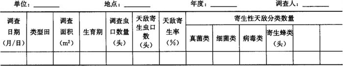 1.3.3 寄生性天敌调查方法 于各代发生盛期,在各田间采集中、高龄幼虫样本,每次采集虫口不少于200头,带回室内分隔在试管内饲养至化蛹。观察寄生性天敌种类与幼虫的寄生率。调查结果填入表6-84。 表6-84 棉铃虫田间寄生性天敌调查表