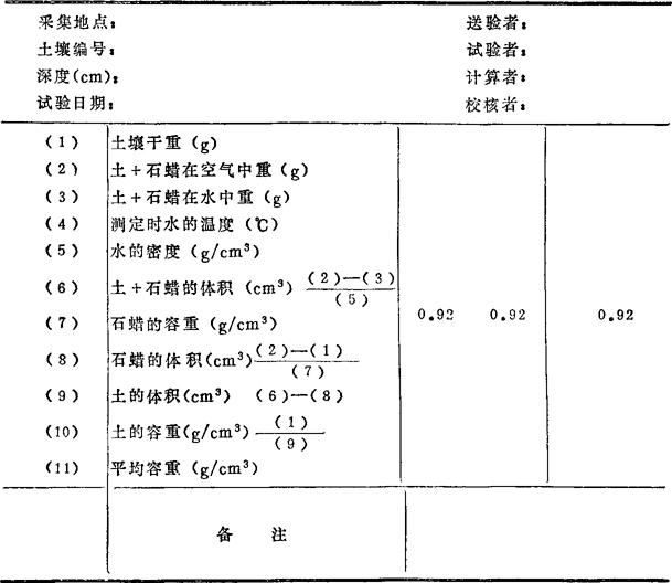 式中:d——土壤容重(g/cm3); M——原状土块重(g); g1——石蜡加土样在空气中的重量(g); g2——石蜡加土样在水中的重量(g); p1——蒸馏水在t℃时的密度(g/cm3),准确至0.001g/cm3; p——石蜡比重为0.92g/cm3; W——土壤含水率(%)。 此法试验须进行两次平行测定,取其平均值,以两位小数(g/cm3)表示,其平行差值不得大于0.03g/cm3。测定记录见表4-4。 表4-4 土壤容重测定记录表(蜡封法)