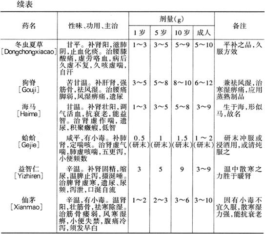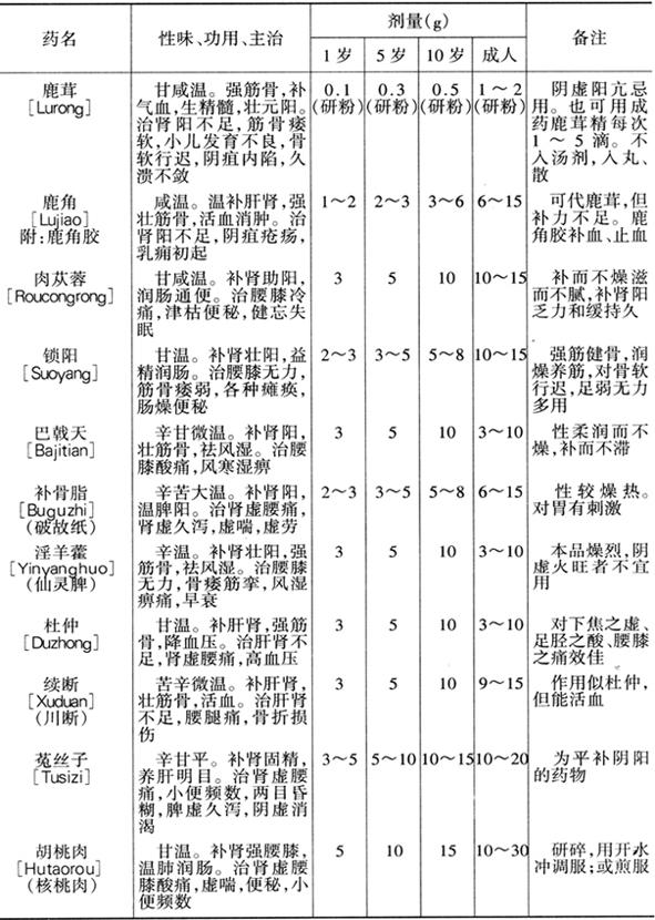 (二)补阳药 又称助阳药、壮阳药。是治疗或改善阳虚病证的药物,具有补肾阳、振心阳、益脾阳的功能。适用于肾阳不足、心阳不振、脾阳虚弱。此类药多温燥,凡有阴虚火旺的症状则应慎用。
