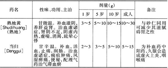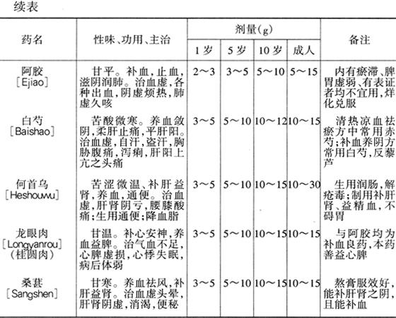 (三)补血药 又称养血药。是用于治疗血虚病证的药物。常用于肝血虚、心血虚。其中有不少药兼有补阴之功,可作滋阴药使用。常与补气药、养阴药同用。此类药多滋腻,食少便溏者不宜用;脾胃虚弱者,应与健胃和中消食之品配用,以免影响食欲。