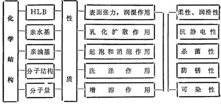 | 释义 | 表面活性剂 表面活性剂是一种有机化合物,其分子结构具有两种不同性质的基团:一种是不溶于水的长碳链烷基,称为亲油基或疏水基、憎水基;另一种是可以溶于水的基,称为亲水基。正因为表面活性剂是由亲水基和亲油基组成的,所以具有能吸附在水油界面上的特性。 1.表面活性剂作用 (1)润湿、渗透作用。当某种固体需要润湿或渗透一部分水分时,在水中添加少量表面活性剂,润湿和渗透就容易得多。 (2)乳化、扩散和增溶作用。表面活性剂能使非水溶性物质在水中成均匀乳化或分散状态。 (3)发泡、消泡作用。在溶液中加入表面活性剂以后,可以使气液相表面形成由液体膜包围的泡孔结构,使表面张力下降的现象称为发泡作用。或防止泡沫形成或使原有泡沫消失称消泡作用。 (4)洗涤作用。这是上述三种作用的综合结果。 2.表面活性剂的化学结构与性能关系 表面活性剂的化学结构和性能间的从属关系大体如图16-13所示。