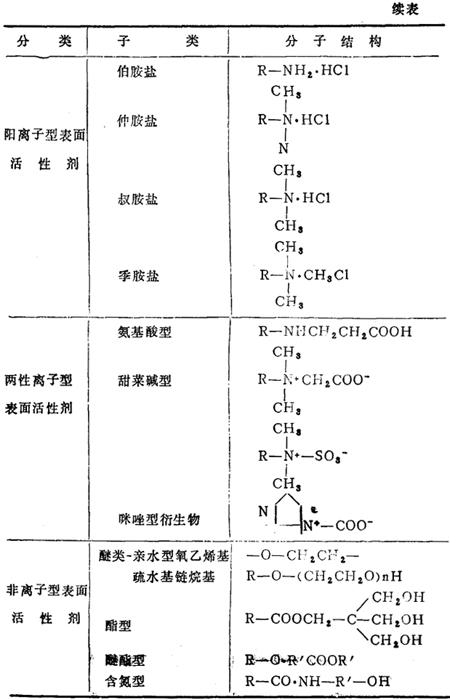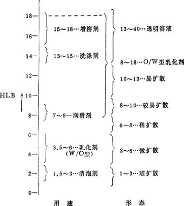图16-14 表面活性剂的HLB值与用途形态关系 (W/O为油包水形乳化,即油为连续相、水为分散相,反之为O/W型乳化剂) 3.表面活性剂分类(表16-78) 表16-78 表面活性剂分类
