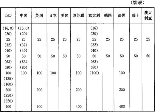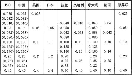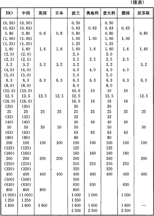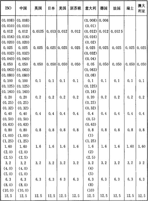 注:表中未加括号的值为优先采用值(标准系列)。 5.我国与国外主要国家Rz、Ry系列值比较(表1-32) 表1-32 我国与国外主要国家Rz、Ry系列值比较