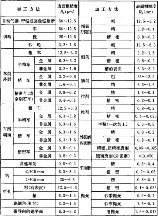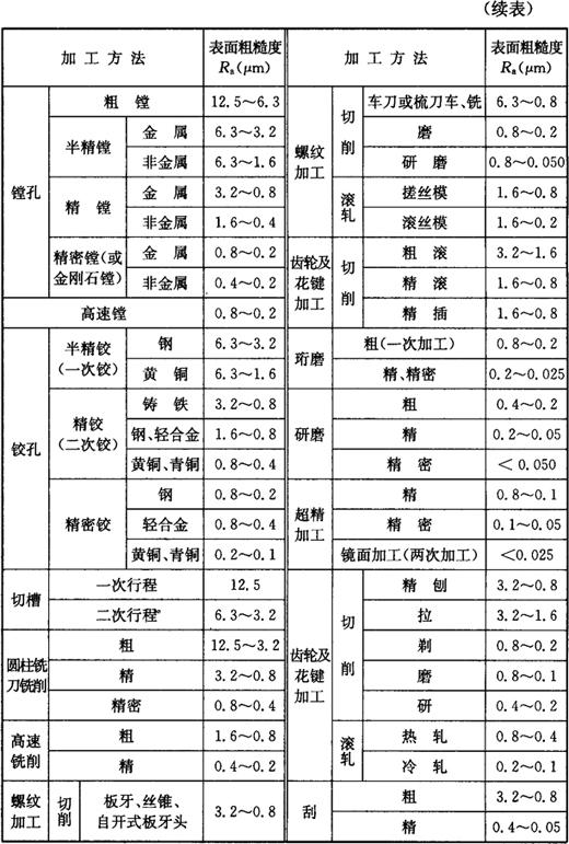 注:表中未加括号的值为优先采用的系列值。Sm、S及tp各国标准中使用很少,故未列出。 6.各种加工方法能达到的表面粗糙度值(表1-33) 表1-33 各种加工方法能达到的表面粗糙度值