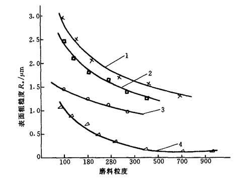 由图4-16可见,被加工材料越脆,粗糙度越大,磨料粒度尺寸越大(磨料编号越小),粗糙度越大.