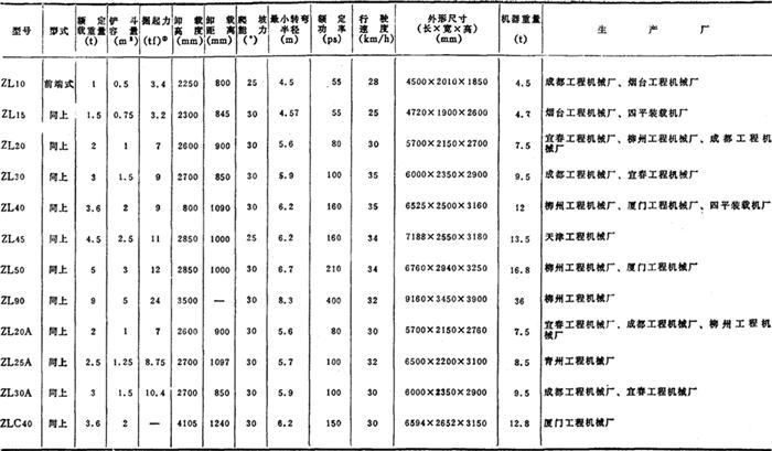 图2-8-53 装载机 (一)ZL系列装载机 适用于盐场坨地堆拆坨、装卸车以及矿山、水电、道路、城建、港口码头、农田建设等场地作业。ZL系列装载机技术参数如表2-8-51所示。 表2-8-51ZL系列装载机技术参数