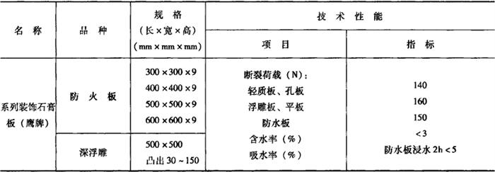 2.装饰石膏板的形状及规格 装饰石膏板产品的主要形状为正方形,其棱边的形状有直角形和45°倒角形两种。装饰石膏板常用的规格有以下4种:300mm×300mm×9mm,400mm×400mm×9mm,500mm×500mm×11mm,600mm×600mm×11mm。 按照技术标准《装饰石膏板》(JC/T799-1996)规定,装饰石膏板产品标记顺序为:产品名称、板材分类代号、板材边长、标准号。例如,尺寸为500mm×500mm×9mm的防潮孔板,其标记为:装饰石膏板FK500JC/T799。生产装饰石膏板的厂家很多,其产品的规格和技术性能也有差异,常用产品如表21-3所示。 表21-3 装饰石膏板产品的规格、技术性能指标