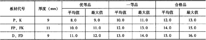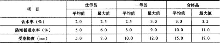 (4)板材与水的性能 装饰石膏板与水的性能主要包括:板材的含水率、防潮板的吸水率和受潮后的挠度,应不大于表21-6中的规定。 表21-6 装饰石膏板与水的性能