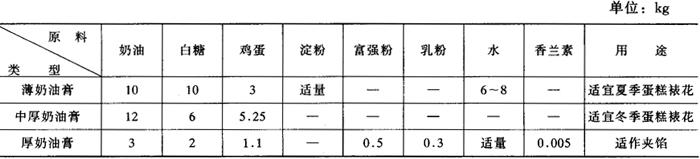 | 释义 | 裱浆和常用饰面料的制作 裱花蛋糕由蛋糕坯和饰面料组成,饰面料占蛋糕总量的30%以上,其质量直接影响裱花蛋糕的口感,而裱花蛋糕的饰面料包括各式裱浆和琼脂糖酱、明胶糖浆、糖水水果等,现分别介绍如下。 (一)奶油膏 奶油膏,简称油膏,又名奶油淇淋或白脱淇淋,是裱花蛋糕、刮面、裱花装饰用的半成品。 1.奶油膏的种类、配方及用途 奶油膏的种类、配方及用途见表2-5-1。 表2-5-1 奶油膏的种类、配方及用途