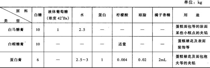 3.制作方法 (1)搅拌 将鸡蛋与糖入搅拌机中搅打,使之均匀,然后再加入牛乳继续搅和均匀。 (2)制糊 把上述蛋奶浆入锅置炉上加温、将淀粉加少量水稀释后倒入锅中,边倒边搅拌,直至成为无粉块的厚糊即可。此则为黄酱。淀粉一定要过筛防止产生粉团,另外加温时,要在锅底不停搅拌,否则易焦底。 注:本配方不加牛乳,用4kg水代替,可用于面包的装饰等。 (三)糖膏 1.糖膏的种类、配方及用途 糖膏的种类、配方及用途见表2-5-2。 表2-5-2 糖膏的种类、配方及用途