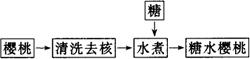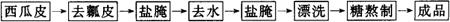 3.制作方法 (1)去瓤削青皮 把西瓜皮挖去浮瓤,削去外表青皮,只剩下清脆的肉质皮。 (2)盐腌 把上述整理好的肉质瓜皮盐腌,一层瓜皮一层盐,10kg瓜皮先用0.5kg盐,腌约一夜取出,挤去水,再用余盐(1kg)腌渍,并用大石块压实。 (3)漂洗 盐腌渍一定时间后,待加工糖瓜时,先把瓜皮用清水漂洗,除去咸味。 (4)糖熬制 瓜条漂洗去咸味后,沥干水分,倒入备好的糖液中,浸渍8~12h后,将糖粉放入糖液中,使其浓度增高40%,再浸8~12h后煮沸约20min,糖液浓缩渗入瓜皮,待糖液浓度到78%~80%时即可出锅返沙。出锅后的瓜条,待糖液全部粘在瓜条上,表面稍干,即散开冷却,瓜条被一层糖衣裹住,即为糖渍西瓜条。 (五)糖水水果 在水果丰收的季节,可直接用新鲜水果,而在不是水果盛产的季节,可使用糖水水果。现以樱桃为例介绍糖水水果的制备。 1.配料(kg) 樱桃1.0,白糖0.5,水2.0。 2.工艺流程
