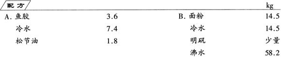 将A中的鱼胶浸入冷水中,约浸4h,然后移到水浴锅内,加热熔解后趁热将松节油加入,并快速搅拌,得A组分。将B中的面粉与冷水混合,搅拌成稀糊状时加少量明矾,然后加入沸水中,并快速搅拌,直至面糊完全变熟为止,冷却后,加入A组分煮好的鱼胶溶液,搅拌均匀,即成产品。