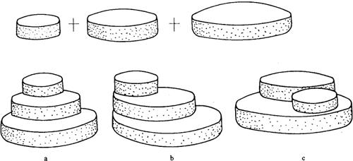 图2-5-1 艺术蛋糕 它们来自于人们熟悉的生活之中,这种表现方式的特点是平易近人,令人感到亲切、可爱,尤其对女性和儿童的吸引力更强。这类艺术蛋糕多被用于家庭、朋友聚会、情侣之间的纪念礼物等。 2.抽象表现 抽象虽也来自于自然形态,但它是对实物形态的提抽与归纳。例如三角形、圆形、方形等都是将具体实物形态的细节舍去归纳而成的几何抽象形体,它区别于具象的最大特征就是脱离了自然实物所限定的属性。因此抽象形体拓宽了想像的余地。比如说一个 抽象表现的特点是形式感强,寓意性、象征性强,富于时代感,因此多被用于高级咖啡厅蛋糕,切块蛋糕的装饰以及庄重纪念性强的庆典蛋糕之中。 3.具象与抽象结合的表现 它具备抽象美的形式感和寓意性,增加了艺术蛋糕的内涵与联想;又有着引人注目的具象逼真的精彩细节的刻画,使艺术蛋糕更具有魅力。 (二)实用技巧与方法 1.构成 构成是指我们要制作蛋糕时的形体布局,第一步是基础。有关它的重要性以及存在,通过下面的试验加以证实。 相信所有的蛋糕师曾面对过双层或三层蛋糕,这个试验我们以三层蛋糕为例,见图2-5-2。