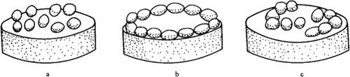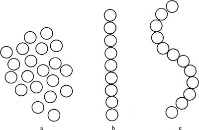 图2-5-3 蛋糕立体布局 我们选用〇的符号来代替我们常用的鲜花或其他装饰物。 a、b、c是用〇形组合的三个图案。我们将它们加以比较。 a是无意识的组合,画面散乱,没有秩序,缺乏联想的暗示。 b竖直的线形组合,虽挺直有秩序但没有活力的想像。 c给人运动的律动感,使人能想像出许多的生命形态。 当物体或实物没有相互组合在一起时,散乱的状态是没有多少意义和感染力的。然而当我们通过思考有序地将物体组织在一起时,从视觉上我们便可以感受出表现力的语言暗示。这种思考就是构图。构图是如何表达语言的方法。我们如何把奶油花、花边等许多饰物放在想要装饰的蛋糕上呢?我们就要学习构图,为饰物找到它在蛋糕上最适合的位置。 我们还用〇形来代表奶油花之类的装饰物。用〇形来布局蛋糕,有三种情况,如图2-5-4a,把〇随随便便地摆在蛋糕上。图中b把〇组成了花边,但中央部分却空空的不完整。图中c是有构图能力,用〇组成了一个S形,创作出一种具有运动的韵律感。