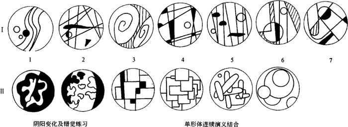 图2-5-9 图形呼应关系 2.多种形状 利用多种形状和材料较之单线更具有丰富的构图表现力。这时的构图练习要按照以上五条注意事项及构图法则进行,尽力去表现完整的画面效果。 (图2-5-10)Ⅰ追求异状形体相组合的对比关系——使用多种形体组合的练习。这种练习要注意主要和次要的关系。例1、2、3、4、5均以线形分割造形为主,其他形状只做辅助对比(增加活泼感),但辅助形的位置布局是十分讲究的。例6、7则是采用形体重叠的构图语言,以重叠形为主,其他形状为辅(图2-5-10)。