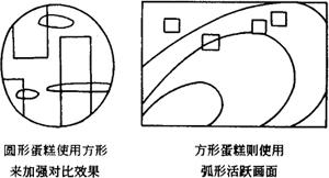 图2-5-2 常见蛋糕构成 图2-5-2常见蛋糕构成是三个没有任何装饰的蛋糕组合。 a是我们经常选用的蛋糕样式,它的特点是圆台形同轴对称,完整感强,其艺术语言是庄重、静穆、崇高等。 b是三个不同轴的组合,它与a相比具有较强的运动感,形体组合活泼,其艺术语言除了同样有庄严崇高的感觉外,还具有向往、追求的暗示。 c是又一种三个圆台的组合构成,它完全不同于a、b的组合特征,它去掉了a、b有的那种庄严、崇高的动感,而是去追求恬静的和睦与温馨。我们似乎可以想像一个家庭,或是朋友、情侣的团聚与甜蜜。 通过以上的试验,我们也许会发现,或者感悟到一种在我们平时并不注意甚至容易被忽视的东西,这就是——艺术,这是一种应该被蛋糕艺术家视为极其重要的元素,因为它关系到你工作的成败。 这个试验让我们明白了构成的意义所在,知道了不同的构成就会组成不同的艺术语言,而利用好这种语言就能表达你的意图与情感,从而也就会较为准确地把顾客的心情和祝愿做进蛋糕作品之中。正因如此,我们的工作才能赢得顾客的心。 单层蛋糕就是否有构成的语言?我们说单层蛋糕也依然有它的构成语汇及丰富的表现能力,它是靠自身的形体变化来实现的,如圆形、方形、多边形等等。 2.装饰 构成是基础,是我们对蛋糕总体设计、布局的理论基础及方法论,那么装饰就可以理解为构成的外衣,是对蛋糕进一步的造型处理阶段。 构成是指蛋糕的立体布局,而构图则是装饰中对蛋糕平面的布局,它是方法又是一种意识。 通过图2-5-3来认识以及理解构图的理论和它在装饰中的作用。