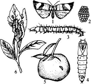 图7-5 褐带长卷叶蛾 1.雌成虫 2.卵块 3.幼虫 4.蛹 5.为害果实 6.为害叶片 【生活习性】 在广东1年发生6代,在浙江1年发生4代。以幼虫蛰伏常绿植物花苞内越冬。4代区于次年4月开始化蛹,4月下旬成虫羽化,产卵。第一代卵在4月下旬至5月上旬出现,5月中、下旬幼虫为害。蛹期在5月下旬至6月上旬,成虫期在6月上旬至下旬。第二至四代成虫分别在6~7月,7~9月,9月发生。各代发生期不整齐,有世代重叠现象。 成虫多在早晨6时羽化,日间静伏于枝、叶上,黄昏后活动。羽化当天即可交尾。交尾后3~4时开始产卵,并于1~7天内产完。卵产于老叶正面。平均每雌虫产卵330粒。常形成2~3个卵块。雄蛾趋光性较强。 在22~31℃时,卵期5~8.5天。幼虫借爬行和吐丝下垂分散。在嫩叶上吐丝缀叶尖后,潜居内中取食,残留表皮,呈枯黄薄膜。3龄后缀4~5张叶一起,把叶食成缺刻或孔洞。幼虫受惊扰迅速后退,吐丝下垂或弹跳脱逃。幼虫期在14~15℃时,56~62天,25~29℃时,21~23天。幼虫老熟重新缀老叶2片,化蛹其中。平均气温28℃时,完成1代需38~45天。 【防治方法】 冬季清除杂草、枯枝、落叶及花苞,消灭越冬幼虫;生长季节,及时摘除虫苞;发生重时喷2.5%溴氰菊酯3000倍液,或90%敌百虫1000倍液,或10%高效灭百可1000倍液。 |