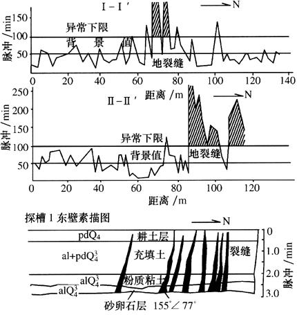 | 释义 | 西安地裂缝放射性调查 西安地裂缝是一种活动的构造性地裂缝,地质调查认为与深部构造相通。地面黄土覆盖较厚,一般大于10m,地下热水发育,潜水面深7~15m,对氡气测量比较有利。西安市西北电管局物资采购站西约300m处,是地裂缝测量地区之一。场地内为农田,地面看不出有地裂缝现象,在拟建印务公司的地区布设四条测线,进行瞬时测氡和电法探测,氡气异常突出,如图5-1所示。经探槽揭露,在0.7m深处发现裂缝,宽在2.0~7.0cm,裂缝面光滑,产状为164°∠82°。在裂缝向东延伸方向的南侧地面下沉0.5m,1987年的建筑物出现裂缝。测氡确定的裂缝与异常位置对应较好,与原推测裂缝位置相比,向西偏移(韩许恒、郁春霞,1997)。