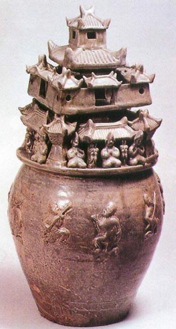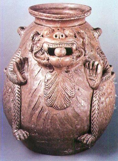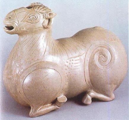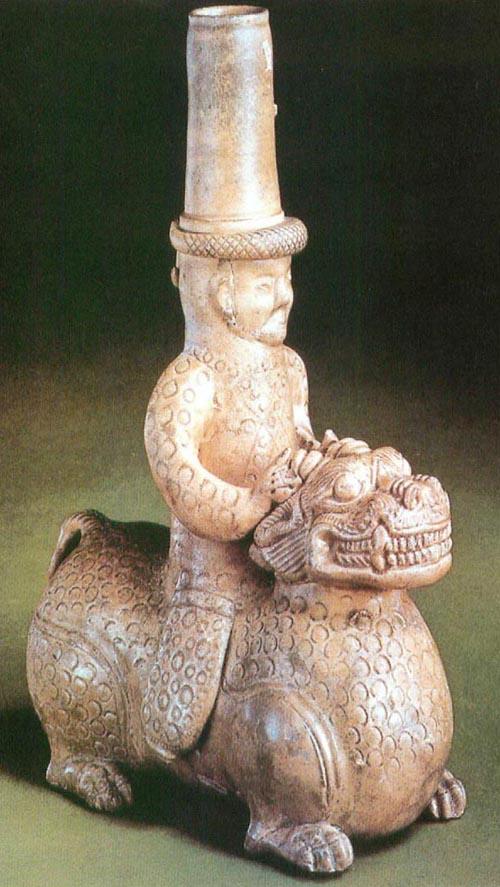 | 释义 | 西晋时期的瓷器 西晋时期(265~316年)的青瓷器还是以越窑为代表,胎子普遍比三国时略厚,色灰;釉子厚而均匀,呈青灰色,有的闪黄。装饰方法主要为压印、刻划、贴塑、模印、捏塑等。常见的纹饰有网格、联珠、忍冬、菱形、锯齿、水波、梳篦、楼阙、舞乐人、祈祷人、禽鸟、家畜、佛像、铺首、避邪、朱雀、白虎、人物(彩版7)等等;器型除了三国时已有的盘口四系壶、洗、盆、虎子(图8、9、10、11)等以外,还有扁壶、鸡首壶(图12)、尊、熏炉、灯(图13)、瓷俑等。器型矮胖,盘、碗、钵等器口沿略薄,但底很厚,器足多做成兽蹄、熊形、龙首、虎头等形状。优秀之作常把器物巧妙地雕塑成鸟兽等形状。如现收藏在南京博物院的青瓷器耳盂的器盖上的捉手做成依偎在一起的双鸽;青瓷神兽尊做成张口睁目、露齿含珠、四肢俱全的怪兽(彩版8);青瓷尊做成憨态可掬的坐熊,还有骑兽高帽人形烛台(彩版9)、鹰形壶、各种兽形避邪(彩版10)等等,非常富有想象力。壶、罐等器皿常装饰有二、四或六个不等的条形系,有的系甚至做成翼鼠、龙、虎等形状。鸡首壶是此时的创新品种,典型形状为盘口,直颈,鼓腹,平底,肩部一面塑很小的鸡头,相对处塑小鸡尾,只是象征性的装饰,没有实用价值(图12)。西晋时少数青釉瓷器上有不规律的褐色斑点,这最初的褐色斑点似为无意中点染上的。