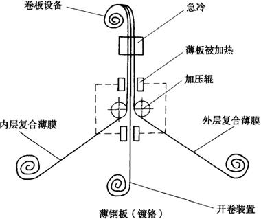 | 释义 | 覆膜铁 发达国家都缺乏锡资源,在经过多年探索之后,于20世纪90年代初,日本、英国、德国率先制成了覆膜板,即在上述镀铬薄板或黑铁原板上,用热覆的方式,使其两表面均为极耐蚀的聚酯薄膜(厚度约为20μm左右)。这种热复合于金属表面薄膜有极优的附着力,能和原薄板一起经受任何冲压、弯折、拉伸等加工。这种薄板的制成工艺原理如图3-3-2所示。