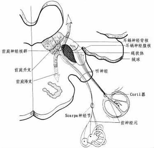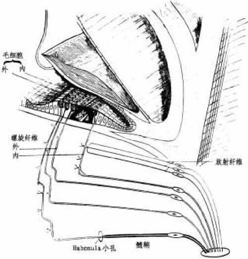 图11-7 耳蜗外周传入途径 听神经细胞体位于螺旋神经节中,可分辨出(Spoendlin)两类神经节细胞:①Ⅰ型细胞(占神经元的95%)是双极的,有髓的神经元有一个很大的细胞体;②Ⅱ型细胞,较小,无髓,此神经元呈单极外观。 Ⅰ型神经元借其树突与内毛细胞发生联系,而Ⅱ型的与外毛细胞发生联系。 (2)传出途径由中枢出发,担负着调节耳蜗的功能。 此途径组成Rasmussen橄榄耳蜗束。 起源:此束包括:①直接纤维,产生于同侧上橄榄核复合体并为橄榄-耳蜗束的1/4。②交叉纤维在脑干里相互联成单独一束。 行程:橄榄耳蜗束首先获得前庭神经干。然后在内听道底,借 Oort迷路内吻合支,再连接耳蜗神经。 终止:存有两种不同的解剖类型:①行向外毛细胞的纤维显粗大,是大细胞,通过一辐射行程直接连接毛细胞。②行向内毛细胞的纤维,由内侧上橄榄核的小细胞产生,通过螺旋行路再接通毛细胞。 这种传出支配在耳蜗基底转处非常丰富。 2.外周前庭途径 包括: (1)平衡传入途径:前庭神经元联合斑细胞和壶腹嵴到延髓-脑桥前庭核。 其细胞体位于前庭神经节内。这些双极细胞,其树突纤维来自感觉上皮,在前庭神经干中的轴突纤维进入中枢神经核。约有20000条有髓传入纤维。 (2)传出途径:组成 Petroff和 Gacek传出束,产生于前庭核群毗邻的网状结构,其纤维分布到感觉细胞中。因此,一根传出纤维可连接60根传入感觉纤维。 |