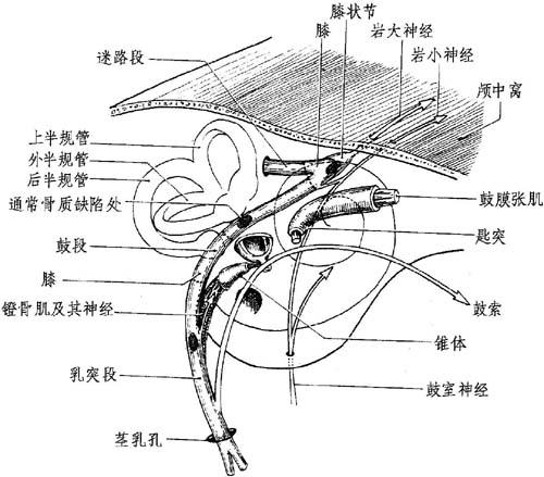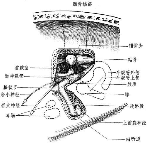 图12-1 面神经管总观 毗邻关系: (1)在前方:耳蜗第1转顶,面神经管围绕此顶稍蜷曲,邻近面神经约1mm。 (2)在后方:前庭,首先位于面神经1mm,然后继续远行。 (3)在上方:岩壳在面神经膝状节隐窝处变薄,因此处面神经升起之故。 内容: 面神经。 面神经中间神经,较细长,是下属组织。 神经鞘或上皮在此分化不良。神经很可能围有蛛网膜套和脑脊液。 神经占据内听道底的整个面神经入口,使之呈一精确的外观。在迷路的其他部位,面神经只占25%~50%的管径(Sunderlaud)。 此处神经的血管供应很缺乏;其以内听道的该部分为转移。 2.膝状节隐窝:这是面神经管的最高部分,最近颅中窝(图12-2)。