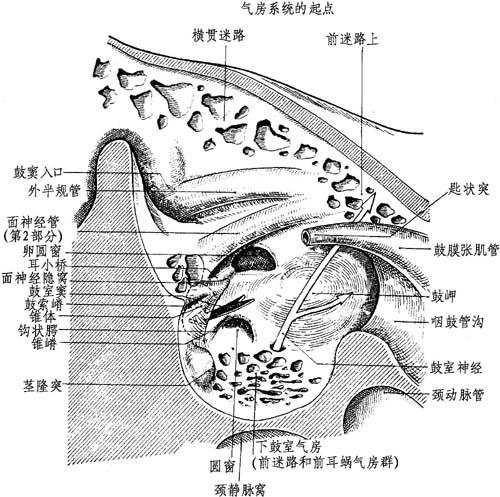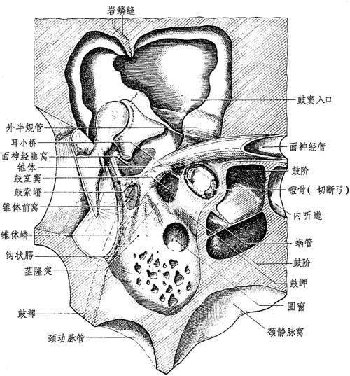 图12-5 面神经乳突内段 此段垂直而下,然而在其下半部可转弯稍向外方,距膝约2~3mm。有时呈直角,常形成一凹面向后的轻度弯曲,延长其弯头的曲度。 毗邻关系: (1)在前方:是为鼓室的倾斜,面神经管岔过鼓室下部向后到圆窗下。鼓沟离面神经管3mm。 (2)在交叉的上方:面神经管适在鼓室后壁,借2~4mm的骨质相互隔开,与之关系重要的有①面神经前方的镫骨肌和锥隆起;②锥隆起前隐窝。 (3)在交叉的下方:由鼓室后唇形成骨性外耳道后壁。 (4)在内方:颈静脉窝组成很重要关系。其先行部分变化很大。面神经及颈静脉球可能由致密骨质分隔,或相反,由厚的或薄的气房分隔,可达8mm。 有时可见发育非常好的面神经下气房群,后者于上部到后半规管的下极。 (5)在后方:①上为鼓窦;②下为乙状窦和面神经间气房群,并将分隔横窦骨壳和面神经管,两者在下方相近且交叉地各行其路。 二腹肌嵴是乳突内的骨性凸起,适为颅外的二腹肌槽,为面神经手术的明显标记。其前端有茎乳孔。 6.面神经第2、3部分内容:这里的面神经围绕着一分化良好的鞘膜,尤其是其转弯部。此鞘膜在面神经第3部分的下部很厚,在该处与骨膜和颅外筋膜紧密相融。 在神经离开管孔时,此部神经的血管供应丰富,是由两条大吻合网组成,来自:①上方的脑膜中动脉岩支;②下方的茎乳动脉、枕动脉或耳后动脉之分支(Moret)。动静脉血管都包括在神经鞘膜层中。 7.异常情况:常可碰到。 (1)面神经管管壁缺损,约占一半以上(据Nager),主要是在鼓段,特别是在卵圆窗上方,然而也有在乳突段的,特别是见于面神经隐窝处。 (2)走行的变异主要表现在面神经管的鼓部和乳突部两段。 (3)乳突内提前分叉或发育不全。 |