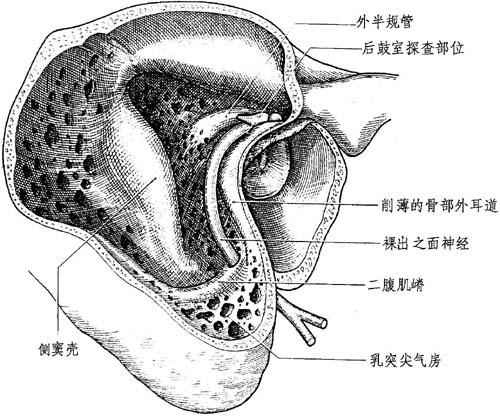 图12-4 面神经膝部 毗邻关系: 在上外方有砧骨窝同鼓窦口和砧骨短突。面神经管位于砧骨短突起后端的下内方(手术重要标志),距该端2~3mm。 在外方骨性增厚使面神经管逐渐变硬,借此把面神经同鼓索分开,同时也是发育好的气房隐藏所,经常有一气房发育特别好,这即为面神经隐窝部,是进行鼓室探查的部位。此部下邻鼓索嵴。 分隔面神经隐窝管的骨壁常菲薄。 在内面,面神经管靠近后半规管的壶腹。在致密岩骨里的面神经和后半规管壶腹仅有2mm硬骨相隔。 在气化型岩骨内有4~5mm的范围常被鼓室窦上部分隔开。 5 .面神经管第3部分(乳突内段):其自锥隆起到茎乳孔一段长约13mm。这是最长的一段岩内面神经,位于骨腔内,有些气房叫面神经骨(据Gelle)(图12-5)。