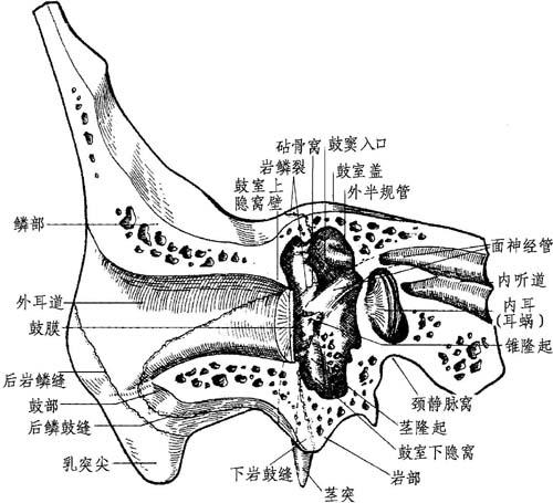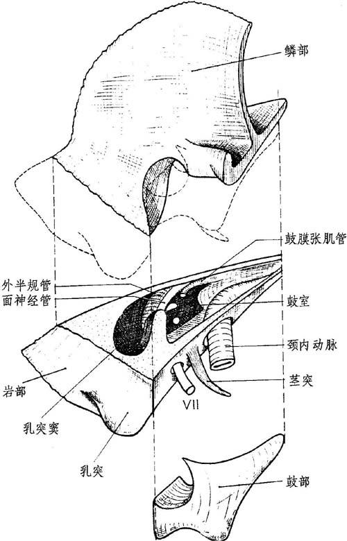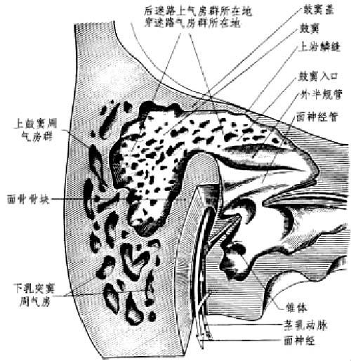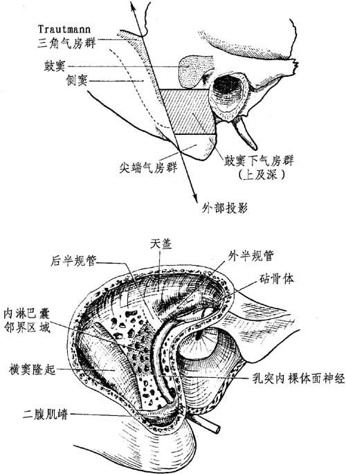 图5-9 乳突、鼓窦、上隐窝术腔 (乳突内关系的外观)