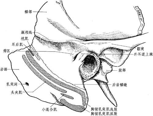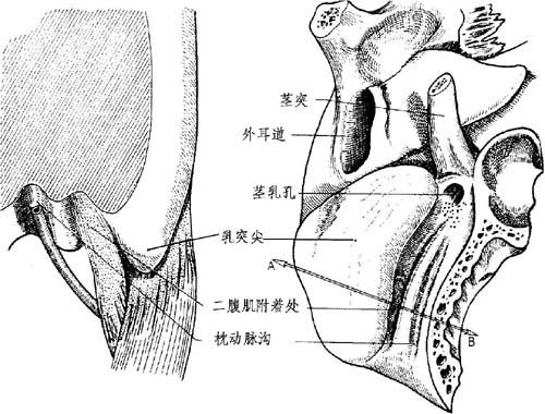 | 释义 | 解剖描述 一、总论 位置:通常之所以称为乳突是因为附着于颞骨上面,位于在颞骨鳞部下方、枕骨鳞部前方,外耳道后方,岩骨锥体的外后方,在此形成岩锥底部。 形状:乳突做为三角锥体具有下前尖,外侧轻度横向展平并且模式图显示:①三个面:外、内及前面;②一个基底,颅内侧;③一个尖或顶,或下尖。 二、外观 (一)外面(图5-1,5-2,5-3)