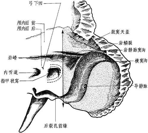 图5-3 外观外面、前、后缘 颅外、表面、手术的标志:由后岩鳞缝将外面锯分为两部分。 1 .后岩鳞缝斜向下、前方。由顶颞缝延伸到乳突前径直到后鳞鼓缝下方。在新生儿(婴儿)被压成沟,而在成人尚残留可见。沟缝内充满结缔-血管组织。 2.鳞上部,呈一底在前方的三角形,界于:上方通过水平的颞线,向后引伸到颧根;前方到外耳道的后缘,向上为鳞部;向下为鼓部。 3 .平滑,压成凹沟,表现: ①外耳道上棘(Henle)为易变的手术标志:位于外耳道的后上方,形状多变,大棘或锐嵴,有时为弧状线,同心向着外耳道。 ②外耳道后筛区(Chipault筛区):位于外耳道棘的后上方;有大量岩部血管穿出;婴儿非常显露并与乳突气化成正比。 4.岩下部:此部厚,不平,向外凸出;占外面下后2/3部分。 这是一处由上至下的肌肉附着地方: ①枕肌的短束止点,平行地分布到后岩鳞缝的上后部下方。在后岩鳞缝下是耳后的细长条(插入点)。②胸锁乳突肌宽束的浅股胸锁乳突肌止点伸延到片筋膜内,在后方成一敞开的堵塞角(钝角),斜向下前方,到枕肌下属的一条线上和后岩鳞缝上面,垂直到乳突前缘的游离中部。其深股胸锁乳突肌使肌腱呈喷火口状到乳突前缘,在后者下方形成尖鞘,循骨后缘的长度上升成V字形头压迹附着平行并在胸锁乳突肌浅股的下方相拢。靠近骨质后缘的头半棘肌短束止于胸锁乳突肌附着“V”之支间的二增厚分岔处。 (二)内面(图5-4)