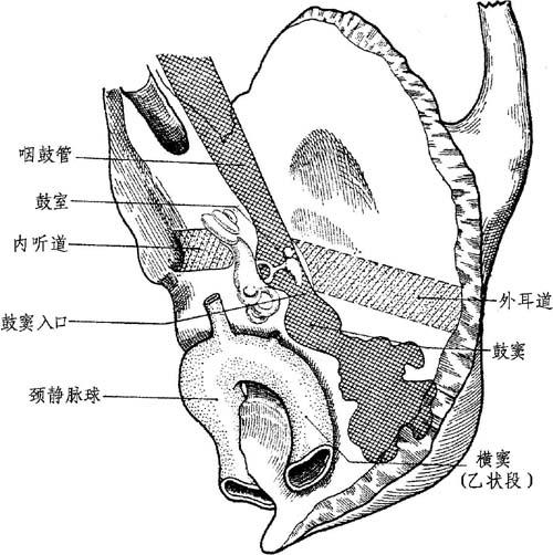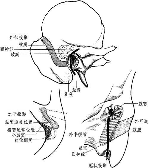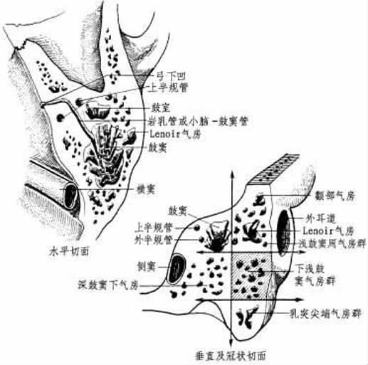 图5-11 乳突内成分投影 其形状、位置、重要标志以及乳突结构等均变化很大,即有气化型的、板障型的、气化板障型的(最常见)、坚实型的(病理型的),此时只有鼓窦。气房直接或间接与鼓窦相通并覆有一层来自鼓室的同一黏膜组织。 从手术利益考虑,气房局部解剖根据矢状切面和与乳突尖成正弦面的气房所在位置(内或外),其中一部分气房分成浅或深两组。另外一部分,按与乙状窦降部前缘的正弦面关系,可分成前、后两组。 乳突尖端气房有其特殊价值。常看到的其他气房群取名为迷路气房群。 1 .窦前前壁 有浅、深二层,此一垂直-矢状正弦切面在岩尖内面分开。 浅层的,自上而下,由下面二群组成,即:①浅鼓窦周气房群,包括Lenoir大气房群在内,到外骨壳和鼓窦的中间处,且不与鼓窦相融合;②浅鼓窦下气房群,是面神经管-乙状窦间延续的浅部气房群。 深层的,自上而下,由下面二群气房组成,即:鼓窦群;深鼓窦下群,Lombard面神经管-乙状窦间延续部分的大量气房,在Mouret颈内静脉-二腹肌乳突的起始处。 附属气房群,变化无常,补充前群、鼓窦上群和面神经周围,特别是面神经后群。非常薄,位于乙状窦周和后各处。 2.后群 极薄,是窦周和后群。 乙状窦周群,位于横窦膝前方,包括:①Trautmann乙状窦间-硬脑膜-角气房群,占据前基底的三角间隙,包括上方硬脑膜和横窦膝下方的气房群(其为上后乳突气房的一部分);②乙状窦-鼓窦间气房群,易变。 乙状窦后群,以乳突导静脉为中心,分布到乳突孔去的一弯弯曲曲管内(此群属于下后乳突群)。 3 .尖端气房群 此群位于二腹肌嵴下方。浅组气房延续到面神经管乙状窦群间所属浅部下方。 面神经位置较深。二腹肌嵴前方组成茎乳孔,为乳突内手术标志。当认出致密骨质后前嵴时便可安全地进行乳突尖端根治术。 然而,面神经管下群可隐伸到面神经下部,达到此嵴的上方、横窦下部的前方。 乳突尖端气房群可能是Bezold所说的乳突尖发源地,属于胸锁乳突肌鞘。 4.迷走群 位于乳突周围的包括: ①颧颞气房群,占据颧长根。儿童期发育非常明显(颧-颞乳突尖)。 ②乳突枕部气房群,延续到枕骨鳞部之中。 ③岩部气房群,后迷路周围气房群产生于乳突内。这些包括:上后迷路气房群,自Trautmann三角横窦间-硬脑膜群产生,常与岩嵴气房群相融合;横穿迷路气房群,由鼓窦内壁产生;下后迷路后气房群,自Lombard横窦间-面神经深群产生。 此群继续到岩尖,是岩尖炎的来源。 乳突气房的黏膜被覆菲薄,仅由单层扁平上皮组成,无腺体。总而言之,其与鼓室的黏膜上皮差异极微小。 (三)毗邻关系 仅指重要的手术关系。 1 .基底的关系:乳突的基底借岩嵴隆起而成水平屏障。 小脑幕大屏障插入此嵴并包裹岩上窦,该窦汇入侧窦膝部。 上邻接部,天幕上(鼓窦盖),菲薄而狭窄。通过脑膜中间的部分行于颞窝(3°和4°颞回)。鼓窦和窦间-硬脑膜-角气房群的上面是属直接关系。 下邻接部,天幕下,由横窦沟斜行分隔。借脑膜内面而附于小脑凹,并与:①向后方,小脑上半月叶的前部;②向前方,小脑扁桃体和二腹叶的下面相邻。 2.内面附于后下腮腺间隙伞顶相邻,与①向前:面神经出口的茎乳孔,距乳突尖10mm;与茎突的基底部相邻;②向前和向内:颈静脉球,由于在外侧茎突基底和在内侧环椎节间的外管段可能相接壤,在内除乳突颈静脉-二腹肌部和乳突尖端之后;副神经外支。 3 .岩尖附属:①在外、下方,于乳突间夹肌的间隙,在胸锁乳突肌深头和夹肌及乳突导静脉窝之间。②在内方,于乳突二腹肌间间隙,在胸锁乳突肌深头和二腹肌间,增大开向颈部(Bezold乳突炎扩散的地点)。 4.外面,手术界缘和皮肤暴露面,由表面到深部:①在皮肤面:由耳后沟标记;②在皮肤下平面,包括:枕动脉和耳后动脉之支及其所属静脉;颈浅神经丛的后耳支和支配耳后诸肌的面神经耳后支。 但上面的肌肉浅筋膜面由颅浅筋膜组成,后者覆盖颞肌、枕肌、耳后肌。向下继续于浅颈筋膜,该膜覆盖:①胸锁乳突肌,斜向下前方;②夹肌和小复合肌群,斜向下后方。 后面向前连接耳后沟皮肤和外耳道纤维软骨部,混入骨质易劈开的后岩鳞缝(在其下面);这些组织粘连都明显,在其下方混淆在一起进入肌群里。 (四)乳突内各组成的投影 影响乳突手术。 这些器官变异表现在形态学方面和标志关系方面。 投影典型的区域是很特定的,应牢记:①鼓窦外观投影在外耳道后上极,平均为5mm,深居筛区内(在儿童),而在成人为10~15mm深,外观在外耳道上棘处(Henle棘);②侧窦在理论上位于岩鳞裂后方,常稍前移些,其膝部投影平均5mm深度,其下部为20mm深;③硬脑膜,理论上看上去在颞线上,也常前移位;④面神经也不太稳定,更向前些。第3段上极鼓窦处的较深些,其在下面接近外壳。 当行鼓窦手术时,术者常保留手术位置到鼓沟平面以上。 总之,乳突内各组成均自二腹肌沟后端水平至以上各处投影到乳突尖、鼓部大斜坡。 (五)血管供应 1 .动脉:供应骨板:①来自脑膜中动脉:岩浅动脉;②来自迷路动脉:弓下凹动脉(Nager动脉);③来自茎乳动脉:后孔动脉。供应皮肤:①自耳后动脉;②自枕动脉。 2.静脉回流:①到岩上窦;②到横窦(乙状窦-鼓窦静脉);③到乳突导静脉。 3 .淋巴:①骨部汇入鼓室淋巴;②乳突窦盖汇入颈淋巴结和二腹肌颈静脉池。 手术,外乳突途径可涉及到:①鼓窦(鼓窦凿开术、鼓窦-上鼓室凿开术、逆行性病灶清理);②乳突全部气房(