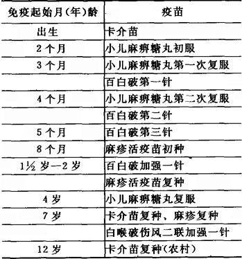计划免疫是按照规定的免疫程序,有计划地利用生物制品进行人群预防接种,以提高人群免疫水平,达到控制以至最终消灭相应传染病的手段。当前我国正在大力开展“计划免疫”工作,国家规定一周岁以内儿童要按照一定的程序完成“卡介苗”、“百白破联合制剂”、“麻疹减毒活疫苗”、“小儿麻痹三价糖丸疫苗”四种制品的接种。我国卫生部在世界儿童生存专题会议上提出:我国在“七五”期间要达到两个85%的目标,即:1988年以省为单位,接种率达到85%;1990年以县为单位,接种率达到85%。其目的是在全国范围内控制结核、百日咳、白喉、破伤风、麻疹、小儿麻痹六种传染病的发生。为此,我国卫生部把每年的4月25日定为全国计划免疫宣传日,广泛宣传,以求实现。