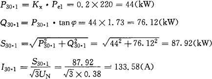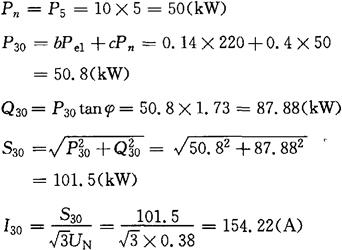 式中 I30——计算电流(A); UN——设备额定电压(V)。 [例6-3] 用二项式系数法确定例6-1车间中金属切削机床组的计算负荷。 [解] 查表1-23,取二项式系数b=0.14,c=0.4,n=5,cosφ=0.5,tan=1.73。