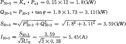 3.用二项式系数法确定用电设备组的计算负荷 在确定设备台数不多,而且各台设备容量相差较大的车间干线和配电箱的计算电荷时,宜采用二项式系数法。 (1)单组用电设备组计算负荷的确定 有功计算负荷 P30=bPe+cPn (6-19) 式中 b、c——二项式系数,根据设备名称、类型、台数查表1-23选取; P30——有功计算负荷(W); bPe——用电设备组的平均负荷,其中Pe为用电设备组的设备总容量(W); Pn——用电设备中n台容量最大的设备容量之和。cPn指用电设备中n台容量最大的设备投入运行时增加的附加负荷(W)。 对1台或2台用电设备可认为: P30=Pe (6-20) 即b=1,c=0 无功计算负荷 Q30=P30tanφ (6-21) 式中 Q30——无功计算负荷(W); P30——有功计算负荷(W); tanφ——与平均功率角相对应的正切值。 视在计算负荷