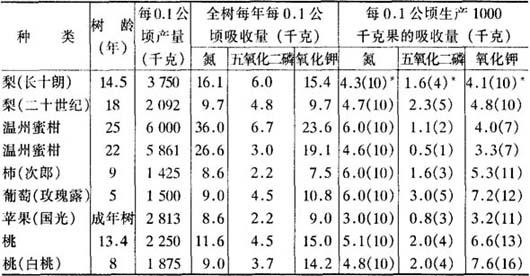 *括号内数字为氮、磷、钾比。 表5-4 苹果树体各器官氮素吸收量(克/株) (辽宁省农业科学院)