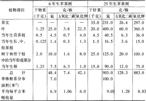 表5-6 苹果幼树和结果树在一个生长周期内的吸肥量