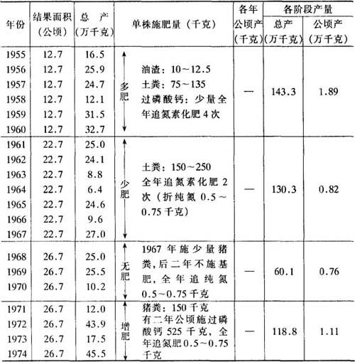 施肥量过多或过少,对果树生长发育均有不良影响。据试验,果树吸肥量在一定范围内随施肥量的增加而增加;超过一定范围,施肥量增加而吸收量下降(表5-8),说明施肥量符合树体要求,是经济用肥的途径。 表5-8 陕西棉花研究所果园1955-1974年20年施肥变化对产量的影响