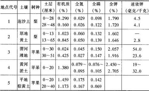 注:1为安徽砀山果园场上坡园,2为陕西乾县南北大队林场,3为西安市草滩农场,4为宁夏灵武广武公社二果园,5为辽宁熊岳农科所二场果园,材料引自原陕西果树所分析室等单位。 土壤酸碱度、地形、地势、土壤温湿度、气候条件以及土壤管理制度等,对施肥量都有影响。因此,确定施肥量应从多方面因素考虑。适宜用肥量,应充分满足果树对各种营养元素的需要,即不过剩,又能经济有效地利用肥料。 |