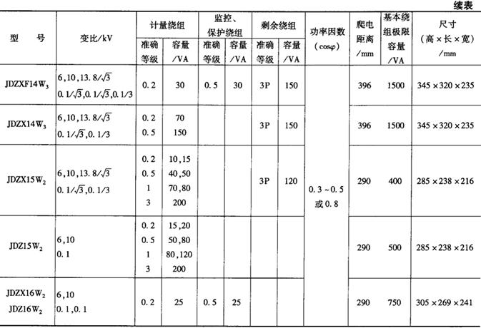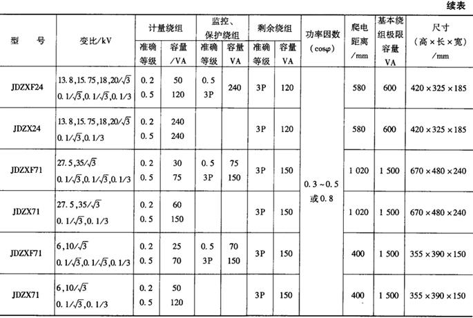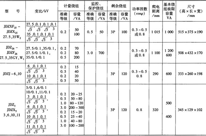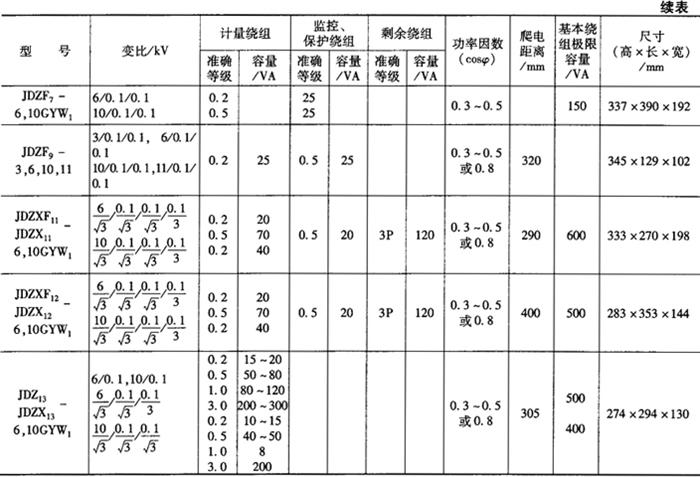 | 释义 | 计量用电压互感器 计量用电压互感器应满足电压、负载、准确度等级、接线方式等技术要求。 1.额定电压 额定一次电压应满足电网电压的要求;额定二次电压应和计量仪表、监控设备等二次设备额定电压相一致,通常取100V。 2.二次绕组数量 具有二个次级绕组,可分别为计量仪表和监视、监控设备提供电压信息。 3.额定二次负载 电压互感器的实际二次负荷,应在互感器额定二次负荷的25%~100%范围内。按照《GB1207电压互感器》的规定,额定二次负荷可在下列标准值中选择(VA):10,15,25,30,75,100,150,200,250,300,400,500,1000。计量专用电压互感器额定二次负荷一般为50VA及以下。 4.准确度等级 电压互感器的准确度等级按计量装置类别选择(见表7-41)。 在额定频率、80%~120%额定电压、额定功率因数、监测绕组接有25%~100%额定负荷时,计量绕组(或计量绕组接有25%~100%额定负荷时的监测绕组)接有25%~100%额定负荷情况下的电压误差和相位误差不得超过表7-42所列限值。 5.准确度级次组合 为满足计量仪表和监控设备准确度等级的要求,计量专用电压互感器的额定准确级组合为0.2/0.2,0.2/0.5或0.5/0.5。 6.额定功率因数 计量用电压互感器所接负荷为感性负荷,功率因数很低,故额定功率因数应为0.3~0.5。 7.接线方式 计量专用电压互感器接线方式的选择,与电网的接地方式有关。当电网中性点为非有效接地方式(如6~35kV系统)时,宜采用两台接于线电压的V-V接线。当电压互感器兼作计量和接地监测时,也可采用三台接于相电压的YNyn接线或一台三相五柱式电压互感器。当电网中性点为有效接地方式(如110~220kV系统)时,宜采用三台接于相电压的YN,yn接线。 8.电能计量用电压互感器主要技术参数 表7-43、表7-44列出了计量用电压互感器的主要技术数据(为广东中山和泰机电厂产品),供用户选型参考。 表7-44 计量、监控(保护)电压互感器主要技术参数