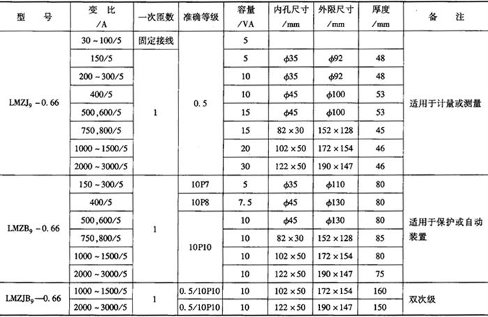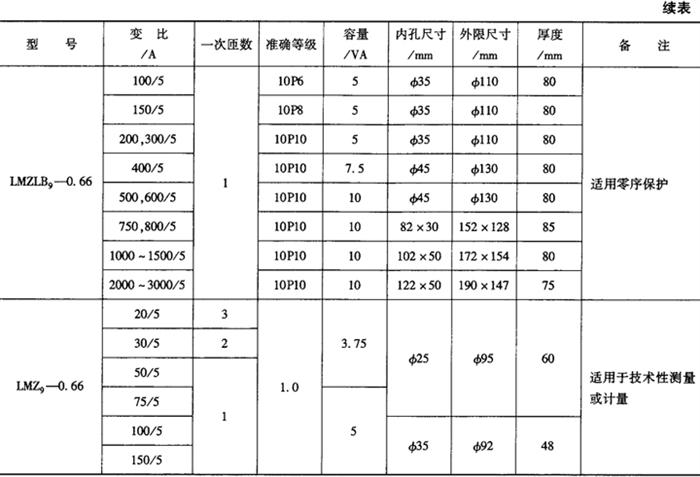 9.高压电能计量箱主要技术数据(中山和泰机电厂生产) (1)油浸式:型式:JLSJWH-3,6,10,27.5,75;一次电压:3,6,10,27.5,35(kV);二次电压:0.1kV;一次电流:1,2,3,4,5,10……1000(A);二次电流:5A;准确等级:0.2级;PT次级容量:15,20,25,30,35(V·A);CT次级容量:10,15,20,25(V·A);总重:27.5,35(kV)为320kg,6,10(kV)为95kg。 外形尺寸(mm):27.5~35kV,高1025×长970×宽450。6~10kV,高700×长574×宽500。 (2)干式:型式:JLSZJ-6,10,一次电压:6,10(kV);二次电压:0.1kV;一次电流:20~1500A;二次电流:5A、1A;功率因数:PT0.3~0.5或0.8,CT-0.8;准确等级;PT-0.2级,CT-0.2,0.25级;二次容量:PT-20~30V·A,CT-10~15V·A;外形尺寸(mm):高575×长×1062×宽807。 10.LVQB系列高压SF6电充互感器 (1)特点:SF6气体绝缘性能稳定,免维护、不停电补气,安全可靠;无油化,不污染环境;高精度,计量级达0.2s级;短路稳定性高,温升低;介损低,局放量小于2pc。 (2)主要技术参数:型号:LVQB-110W2,145W2,220W2额定电压(kV):110,132,220;电流变比(A):2×300/5,2×400/5,2×500/5,2×600/5,2×750/5,2×1000/5,2×1250/5。额定一次电流(A):300~2500;额定二次电流(A):5,1;次级数量:220kV,6个次级,其中4个5P(或10P)级,1个0.5级,1个0.2(或0.2s)级。110kV,132kV5个次级;其中3个5P(或10P)级,1个0.5级,1个0.2(或0.2s)级。 热稳定电流(kA,3s):31.5~63。 动稳定电流(kA,峰值):80~160。 外绝缘污秽等级:Ⅲ级,爬电比距:25mm/kV。 SF6年漏气率:≤1%。 (3)TYD系列高压电容式电压互感器:型号:TYD110/ 11.低压计量用电流互感器 (1)穿心式电流互感器:型式有LMZ-0.66、LMK-0.5两种。变比为5~300/5A,150A及以上均为单匝。准确等级:0.2s,0.2,0.5s,0.5。 穿心孔尺寸(mm):Φ30、Φ35、Φ45、Φ55、Φ65、Φ75、Φ100、Φ125圆加扁孔:Φ35+52×8,Φ45+63×11,Φ40+60×11,长方孔:82×30、93×32、103×50、122×50。 (2)母排式电流互感器:型式为LMZ3-0.66;变比为150~20000/5;准确级:0.2、0.5;穿孔尺寸及可穿母线:42×20/40×5,52×25/50×6,62/25/60×8.82×25/80×10,102×30/100×12,127×50/2(120×12),230×55.270×55。 (3)LQZ、LQK型电流互感器:变比为5~400/5、1、0.5、0.25(A);准确级为0.2,0.5;安装孔Φ8×90/mm。其中LQZ为树脂浇注型;LQK为塑料或电木粉压制型;预先绕好一次线圈,安装时不需穿线。 常用低压电流互感器技术参数见表7-39。 表7-45 低压电流互感器